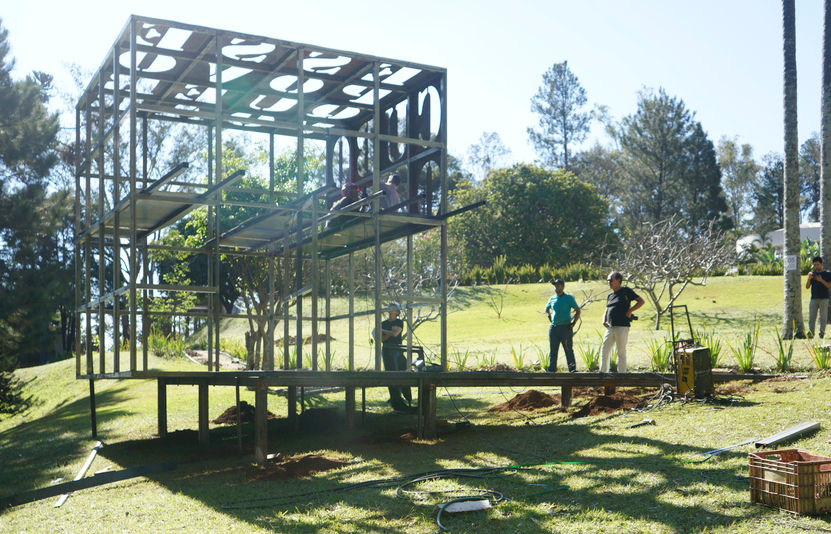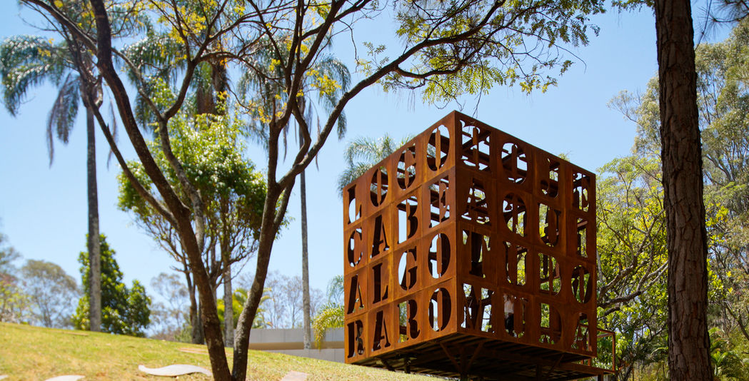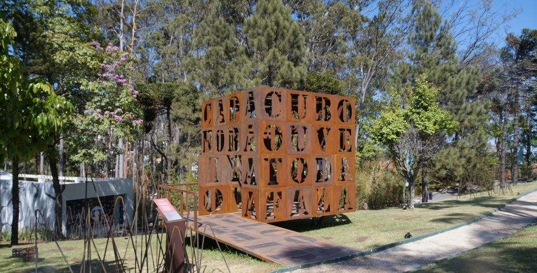 ESSE POVO QUER VOAR. No espaço interior ouve-se uma trilha sonora, composta e executada pelos arquitetos, que propõe pulsações e falas diversas propondo uma pulsação mais contemplativa e reforçando a experiência sensorial da visita. Esse som pode ser ouvido em https://soundcloud.com/pterodata/cuboesia. Em volta deste cubo de metal está o JARDIM DE AÇO que é uma instalação com vergalhões dobrados modularmente em três tamanhos que, interagindo com a vegetação local, sugere que o metal é também um elemento da natureza. Esse paradoxo sinaliza que esse material, proveniente da mineração e da siderurgia, nessa composição, denuncia o descaso e a demagogia ambiental. Nesse jardim, as letras soltas pelo gramado convidam as pessoas a montarem suas palavras numa atitude interativa. Ali propõem-se também um ambiente de permanência, uma pequena praça de onde pode-se apreciar o conjunto desde o banco em perfil metálico, entre as letras e cubos de menor escala e diferentes textos, que antecederam o principal que tem cada uma das faces medindo 4 metros. O gesto de se utilizar as letras provenientes dos recortes das faces do cubo, como se fossem plantas espontâneas do jardim, sugere uma atitude de design ecológico que procura não gerar resíduos. Outro aspecto sustentável dessa proposta é sua possibilidade de desmontagem permitindo que seja reapresentada diversas vezes em diferentes locais. Esse projeto gerou um inesperado interesse nas crianças em fase de alfabetização. A partir de visitas de escolas ao local os arquitetos imaginaram um exercício interativo onde uma folha de papel com as faces de um cubo retificado foi entregue aos estudante com a proposta que escrevessem o seu poema e posteriormente montassem o seu cubo. Assim essa experiência de geometria e poesia poderia, numa atitude autoral, ser vivenciada pelos jovens estudantes que posteriormente expuseram o resultado em sala de aula.